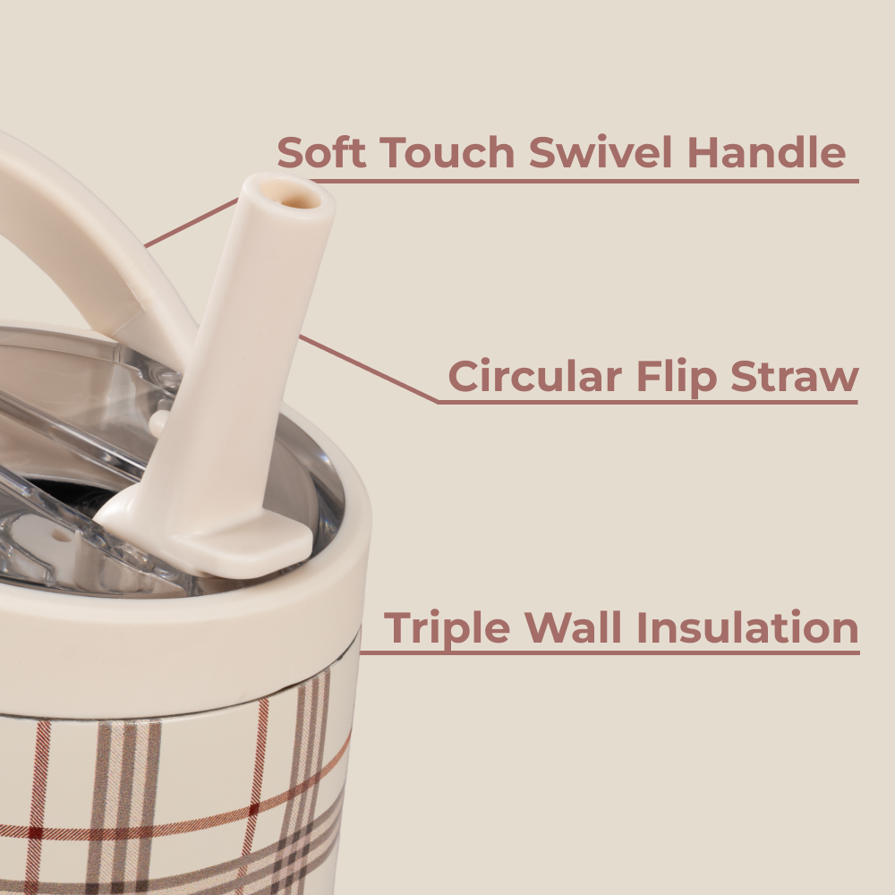 The HydroJug Sport 20oz in Blair delivers everyday hydration in a compact, functional design. Its cream base with a subtle plaid pattern makes it versatile enough for work, workouts, or weekends. Lightweight and portable, this 20oz Sport Bottle fits easily into cup holders, backpacks, and gym bags. Triple-layer insulated stainless steel keeps drinks ice-cold for hours, helping you stay refreshed through busy schedules and active routines. Completely leakproof with the straw down, this tumbler includes a circular flip straw for smooth sipping, plus an ergonomic bucket handle for easy carrying. A protective rubber base prevents scratches and reduces noise, while the dishwasher-safe body makes cleanup simple. Practical, durable, and compact, the Blair water bottle is hydration designed to support your health and wellness wherever the day takes you. Dimensions: 3.4" x 3.4" x 7.64" Base diameter: 2.59" Capacity: 20 ounces of water ~ 592 mL Weight: 14.72oz ��� WARNING: CHOKING HAZARD ��� Small Parts. This product contains small components that may pose a choking risk. Not suitable for children under 3 years old. Inspect regularly for damage. For questions or concerns, contact customer support.