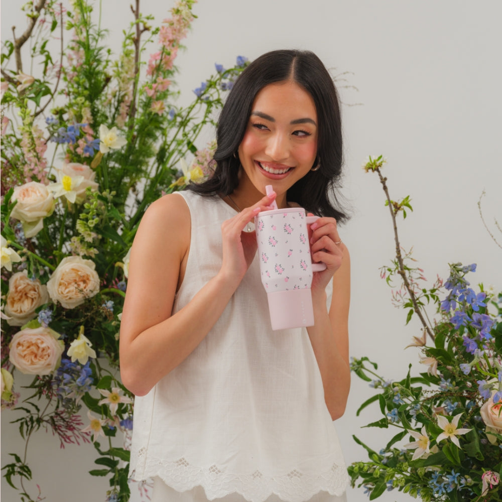 Keep hydration simple with the HydroJug Traveler 20oz in Wildrose. With its creamy white finish decorated with soft pink roses, this compact water bottle adds a gentle design touch while supporting steady hydration for kids, adults, and anyone on the go. The 20oz capacity is perfectly portable ��� small enough for backpacks, lunch bags, and cup holders, yet dependable enough to provide hydration through busy school days, commutes, or daily routines. Built from durable stainless steel with triple-wall insulation, the Wildrose tumbler keeps drinks cold for hours, and its dishwasher-safe construction makes cleanup easy. Designed for everyday convenience, it���s completely leakproof with the straw down, equipped with a hygienic circular flip straw for easy sipping, and includes a removable silicone boot to protect both the insulated bottle and the surfaces you place it on. Lightweight, practical, and versatile, it���s hydration designed for the whole family in a grab-and-go size. Dimensions: 3.35" x 4.78" x 7.62" Base diameter: 2.76" Capacity: 20 ounces of water ~ 592 mL Weight: 14.72oz