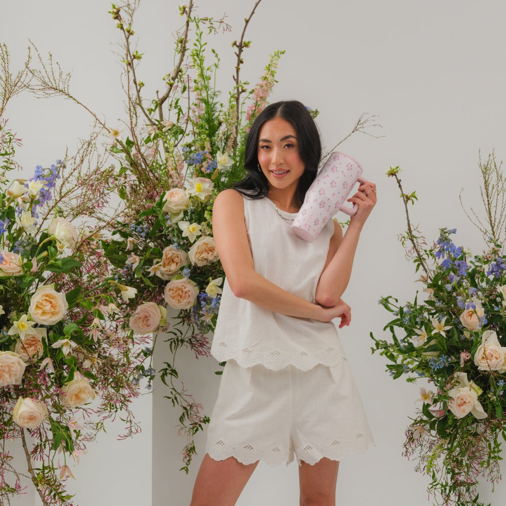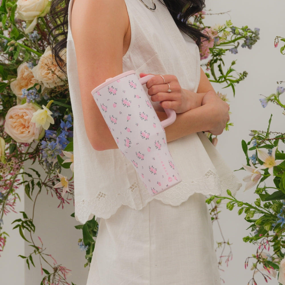 Support your daily hydration with the HydroJug Traveler 32oz in Wildrose. Featuring a cream base with soft floral accents, this water bottle adds a subtle design touch while helping you stay refreshed during workdays, commutes, or time outdoors. The 32oz capacity provides the ideal middle ground ��� large enough for steady hydration through long days yet light enough for easy portability. Made from durable stainless steel with triple-wall insulation, the Wildrose tumbler with handle keeps drinks cold for hours, and the dishwasher-safe design makes cleaning simple. Built for convenience, it���s completely leakproof with the straw down, equipped with a flip-straw lid for smooth sipping, and shaped with a cupholder-friendly base. An ergonomic handle ensures easy carrying wherever your routine takes you. The HydroJug Traveler 32oz is a dependable insulated water bottle that blends performance, durability, and capacity, making it easy to stay on track with hydration goals every day. Dimensions: 3.78" x 5.4" x 9.3" Base diameter: 3.0" Capacity: 32 ounces of water ~ 946 mL Weight: 17.28oz